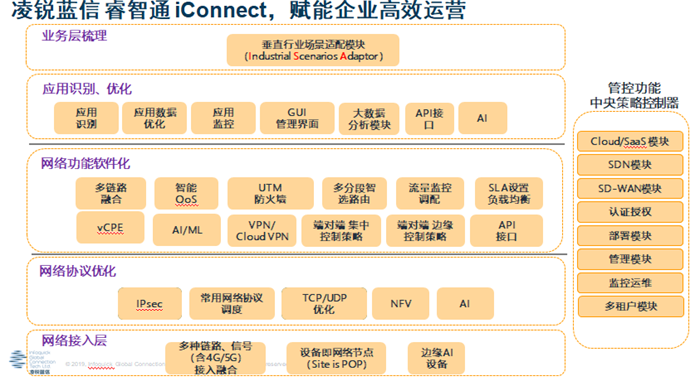 凌锐蓝信iConnect,SD-WAN 3.0 技术,可以先从业务场景入手,首先帮助企业或5G运营商梳理业务层需求;再进行应用数据的识别、分类、优先级排序;而后再调用网络功能,特别是智能路由、SLA导向负载均衡、智能QoS这3种模块,让各种特别场景的流量有序传输。这就好像5G是一条16车道的超级高速路,尽快够宽,也架不住100辆车同时并排行驶。那当然就要把他们精管分类,有序跑起来,确保每辆车都保持最高速度。iConnect系统在自动做上述精控过程,小于1ms(毫秒)。