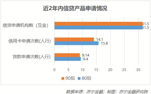 人行征信报告显示,80后和90后申请贷款的次数非常接近,在信用卡申请上似乎80后比90后更积极,近2年的平均申请次数多了1.7次。