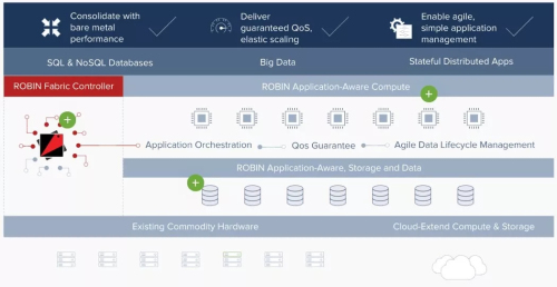 Robin技术的关键是它的应用感知结构控制器(Application-Aware Fabric Controller),它是所有应用部署和数据移动的管理层。它控制和管理着两个主要资产,即应用感知计算平面(Application-Aware Compute Plane)和应用感知存储平面(Application-Aware Storage Plane),这两个资产分别将计算和存储虚拟化,消除了容量的孤岛。控制器能够根据单个应用的需求以及环境的拓扑结构智能地提供容器和存储,并配置应用以充分利用这些组件。这使得通过一次点击来部署Cassandra和Hadoop这样的复杂的多容器应用成为可能。此外,Fabric Controller确保了所有应用获得足够的计算、存储和网络资源,以满足用户定义的服务质量要求;保证了所有应用的性能的可预测性。Robin控制整个I/O路径,因此它可以管理读/写请求的优先级,而且可以提供保证的最小和最大IOPS级别,以确保应用的性能不受邻近噪声的影响。