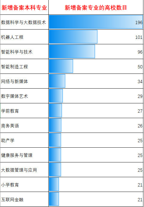 虽然术业有专攻,但AI本身涉及到的技术或者产业就非常广泛,所以除了人工智能专业之外,一些旁支的专业也是未来进入AI行业的敲门砖,包括今年新增备案数量最多的几个本科专业:数据科学与大数据技术、机器人工程、智能科学与技术。