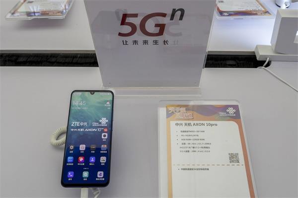 (上海一家联通营业厅展示的一款来自中兴的 5G 手机 | 视觉中国)