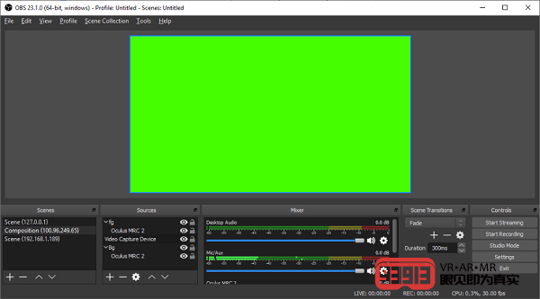 启动Oculus Quest上的混合现实捕获应用程序,并使用新的Oculus混合现实插件合成OBS(一个免费和开源的跨平台流媒体和录制程序)中的镜头。