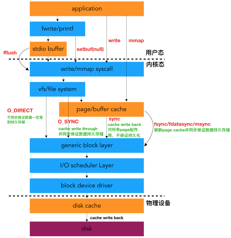 在很多IO场景中,我们经常需要确保数据已经安全的写到磁盘上,以便在系统宕机重启之后还能读到这些数据。但是我们都知道,linux系统的IO路径还是很复杂的,分为很多层,每一层都可能会有buffer来加速IO读写。同时,用户态的应用程序和库函数也可能拥有自己的buffer,这又给IO路径增加了一些复杂性。可见,要想保证数据安全的写到磁盘上,并不是简单调一个write/fwrite就可以搞定的。