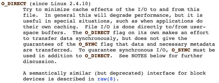 由于O_DIRECT会bypass page cache,因此如果有另一个进程使用普通的方式读文件,有可能会出现数据不一致的现象,这个也需要注意。