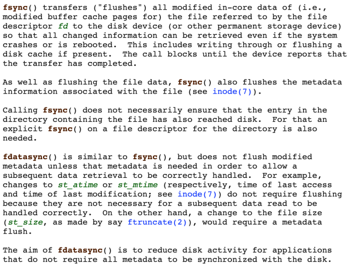 fsync和fdatasync的区别:http://man7.org/linux/man-pages/man2/fsync.2.html