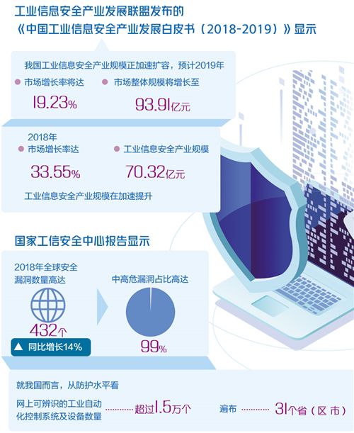 工业信息安全产业发展联盟在大会上发布的《中国工业信息安全产业发展白皮书(2018-2019)》显示,我国工业信息安全产业规模正加速扩容,预计2019年,市场增长率将达19.23%,市场整体规模将增长至93.91亿元。
