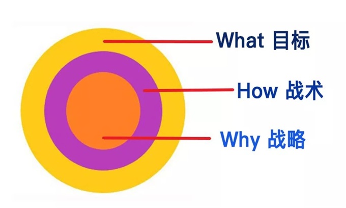 最中心的圆告诉你为什么开始,告诉你应该选择什么样的战略;而中间的圆是如何做,也就是战术;最外面的圆是你最后要达到什么样的目标。