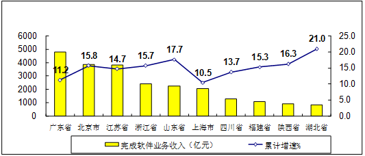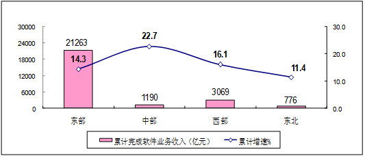 东、西部地区软件业保持较快增长,中部地区增势突出。1-5月,东部地区完成软件业务收入21263亿元,同比增长14.3%,增速与去年同期持平。中部地区完成软件业务收入1190亿元,增长22.7%,增速同比提高3.3个百分点,高出全国平均水平8个百分点。西部地区完成软件业务收入3069亿元,增长16.1%,增速同比提高2.2个百分点。东北地区完成软件业务收入776亿元,同比增长11.4%,增速同比提高2.8个百分点。四个地区软件业务收入在全国总收入中的占比分别为:80.8%、4.5%、11.7%和3.0%。