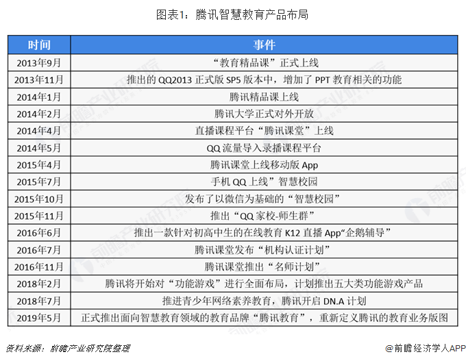 2013年起,腾讯首次切入在线教育市场,主打职业教育的腾讯精品课成立,2014年主打职业教育的腾讯课堂成立、2015年智慧校园上线、2016年K12教育企鹅辅导成立,涉及腾讯微校、腾讯智慧校园、QQ智慧校园等自营教育业务。业务大部分以QQ与微信等工具相结合作为基础而展开,从而形成腾讯在线教育闭环。