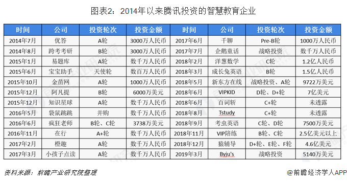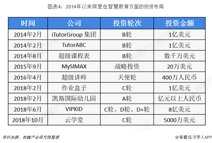 除了自建平台以外,阿里也积极布局智慧教育细分领域,2014年以来,阿里集团在智慧教育领域投资事件有9起,主要也是布局K12阶段教育,其中比较成功的案例有作业盒子和VIPKID。