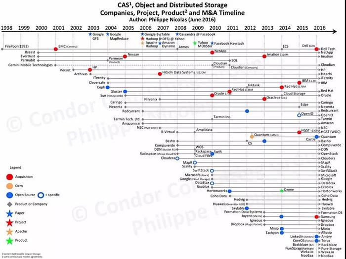Philippe Nicolas精心制作的电子表格——他绘制的内容寻址存储(CAS)/对象存储发展历史图。