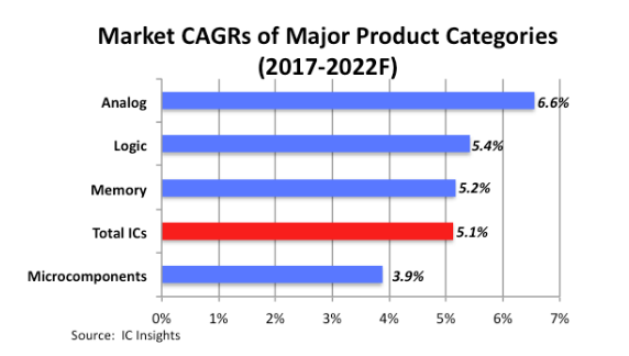 IC Insights预测未来五年整体集成电路市场的年复合增长率在5.1%左右。2017年全球集成电路市场增速达到22%,IC Insights预计2018年全球集成电路增速将达到8%,规模达到3939亿美元,2022年全球集成电路市场规模将达到4668亿美元。