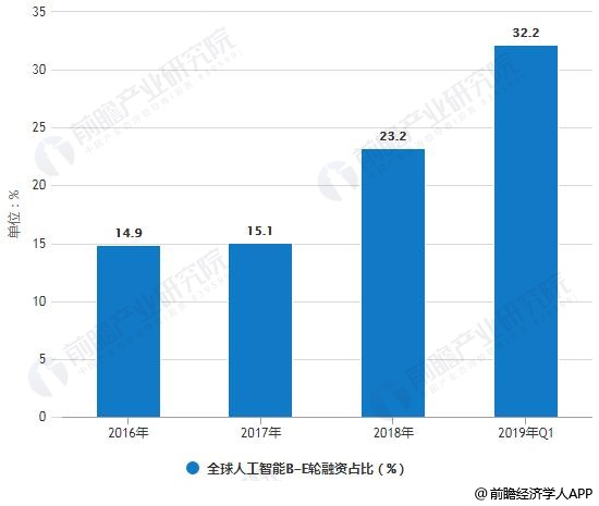 2016-2019年Q1全球人工智能B-E轮融资占比统计情况