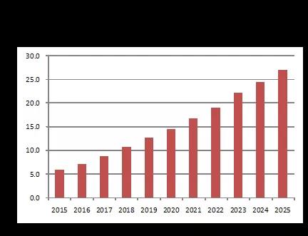 从上图可以看出,物联网的业务需求非常巨大。IoT连接数预计将从2015年的60亿增加到2025年的270亿,复合年增长率高达16%。