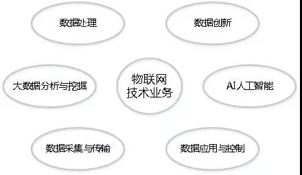 从上面物联网的业务需求可以看出,物联网技术主要是完成各种传感器设备与互联网的无线连接,实现设备或终端的开关信号或数据的传输,其中传感器的无线连接方式,是非常重要的一环,见图5所示,图中的数据采集与传输、数据应用与控制等与物联网技术息息相关。而数据处理、大数据挖掘和分析、数据创新、人工智能等环节,则与工业4.0、大数据、云计算、AI等同步发展,对物联网技术业务起到有力的支撑。