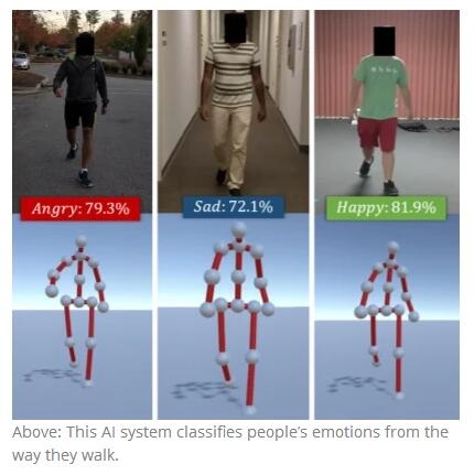 人工智能系统处理了来自“情感漫步”(Emotion Walk,简称EWalk)的样本。EWalk是一组包含1384个步态的新数据集,这些步态是从24名受试者在大学校园(包括室内和室外)散步的视频中提取的。