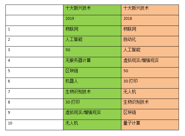 ▲两项新技术,无服务器计算和机器人技术,被列入2019年名单,取代了自动化和量子计算。