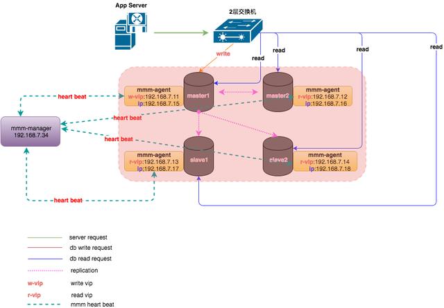 如上所示,整个MySQL集群提供1个写VIP(Virtual IP)和N(N>=1)个读VIP提供对外服务。每个MySQL节点均部署有一个Agent(mmm-agent),mmm-agent和mmm-manager保持通信状态,定期向mmm-manager上报当前MySQL节点的存活情况(这里称之为心跳)。当mmm-manager连续多次无法收到mmm-agent的心跳消息时,会进行切换操作。