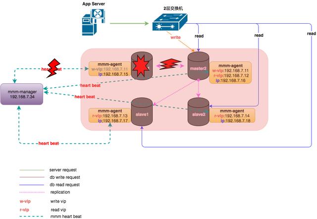 mmm-manager检测到master1发生了故障,对数据进行补齐之后,将写VIP漂移到了master2上,应用写操作在新的节点上继续进行。