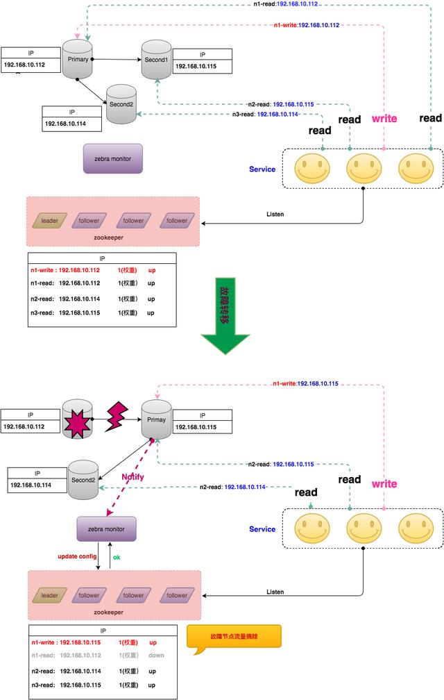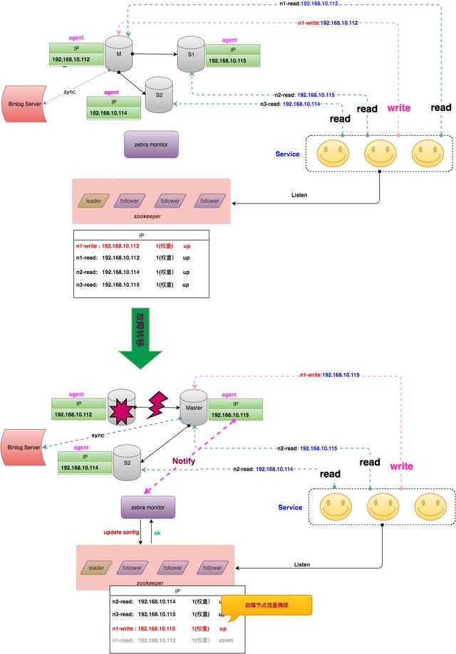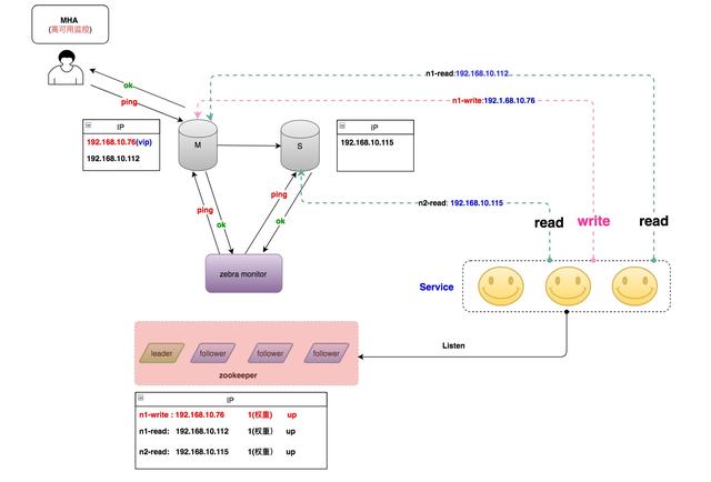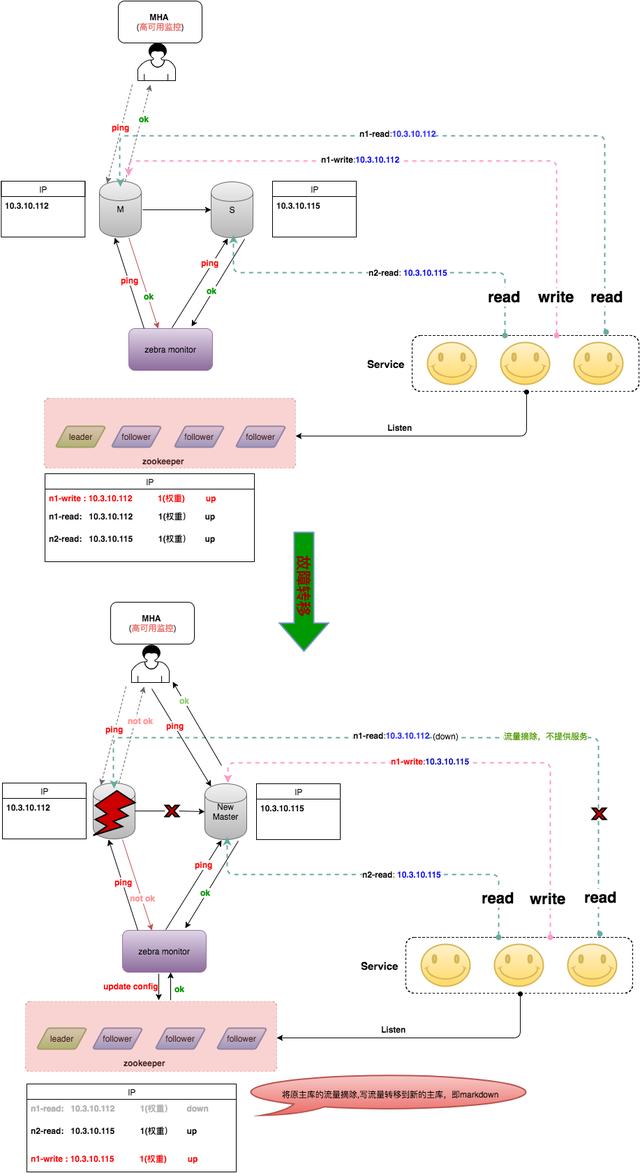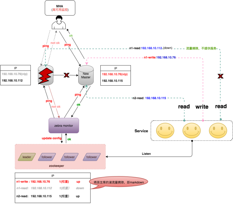 当MHA切换完成之后,主动发送消息给Zebra monitor,Zebra monitor更新ZooKeeper的配置,将主库上配置的读流量标记为下线状态。