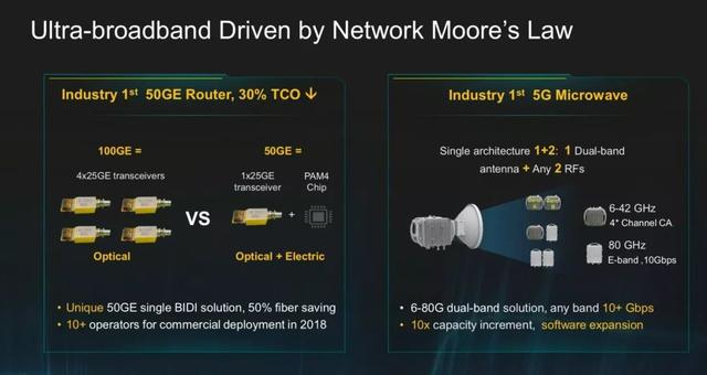 针对有光纤场景,华为基于PAM4的50GE路由器支持80km和单纤双向传输,实现每比特成本降低30%,节省50%的光纤资源;针对无光纤场景,华为5G微波解决方案可实现任意频段的10Gbit/s带宽接入,同时基于灵活的信道扩展能力,实现一次上站,综合TCO降低30%。