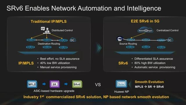 华为5G承载解决方案可同时支持MPLS和SR协议,5G业务部署E2E SR/SRv6、4G继续用MPLS协议,新业务部署对原业务无影响;同时华为SR/SRv6解决方案基于NP可编程架构,无需硬件改动即可支持从MPLS到SR,再到SRv6的平滑演进。
