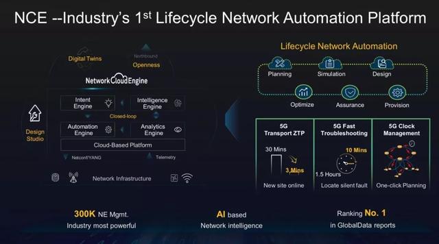 3)业界首个管理、控制、分析合一的网络云化引擎(Network Cloud Engine,NCE),支持承载网全生命周期自动化运维。