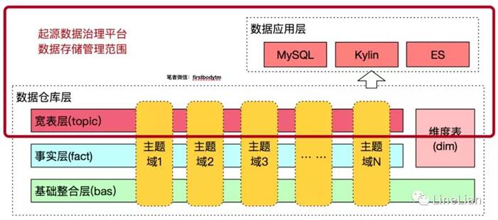 起源数据治理平台管理的数据存储范围包括:数据仓库中的Topic层和数据应用层,存储方式包括:Hive、MySQL、Kylin、Palo、ES、Druid。如下图所示: