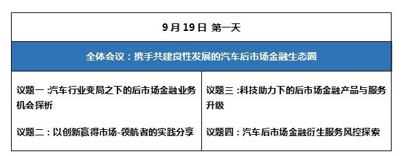针对汽车行业格局的最新变化,设置议题覆盖汽车后市场金融业务的国内外发展趋势、经营管理、风险控制、产品创新、渠道创新、商业模式、跨界合作、数字化应用案例等多个维度。为您提供全景式的行业焦点问题展现与解答。