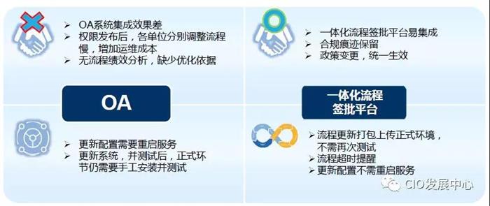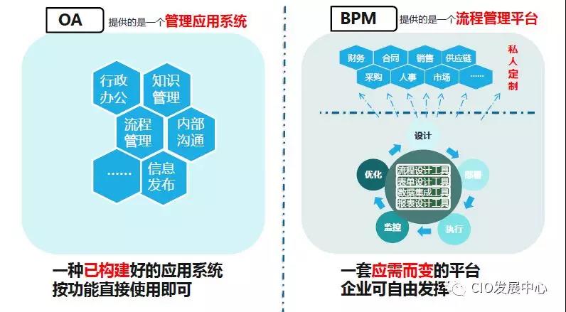 BPM和OA有什么区别呢?其实OA是一个管理应用平台,如果我们不谈统一的BPM的时候,业务流程的管理平台是通过OA平台承担起来。市场瞬息万变,技术日益更新,在这样的状况下,如果还在用OA(当然并不是说放弃使用OA平台),需要区分清楚两者的概念,赋予这两个平台以定位。OA最早的时候是为了解决信息孤岛的问题,让信息流流通起来。北汽新能源的OA系统基本用了4-5年,对其的定位是门户、文档管理,这的确是OA的擅长之处。但BPM平台是要承担整个的流程管理,包括日常审批流程、合同流程、采购流程等,将这些流程靠流程平台做起来,BPM能够快速响应的业务的需求,业务部门可以依靠BPM平台定义自己的流程模型,也可以在平台上做相应的基于业务灵活变动的设置,从而快速响应业务的需求。