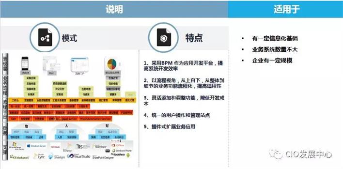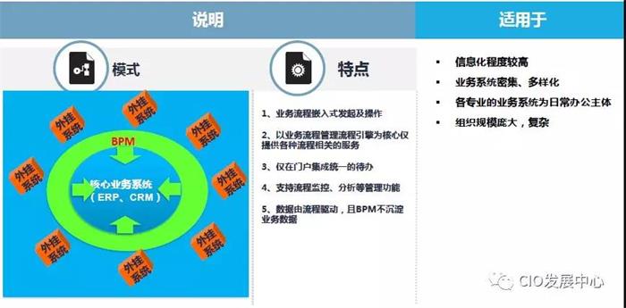 第二种是纯服务模式。我们北汽新能源正在走这条路,是希望把BPM作为核心的流程引擎,仅提供与各种流程相关的服务。我们现在逐步把一些流程搬到引擎平台。希望未来不管做质量流程、财务流程,还是采购合同流程,最终都有一个统一的流程引擎平台,达到流程的模型化、管理化与优化的目的。这种模式其实适用于信息化程度较高,业务系统密集,并且以业务系统作为日常办公主体的企业。