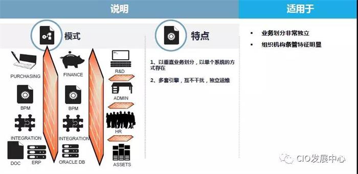 另外,还有一种是比较少见的系统模式。适用于更为巨大的公司,业务划分非常独立,组织机构条管特征明显,并且各自的应用领域都有自己的BPM。