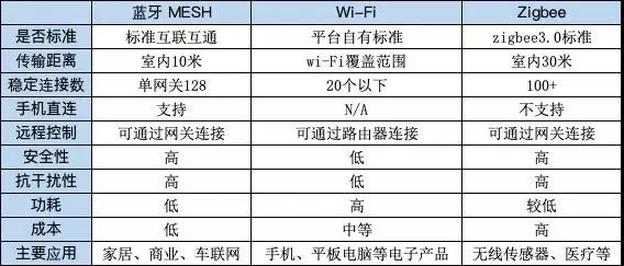 从设备传输功耗来看,BLE Mesh功耗最低,Zigbeb功耗略高于BLE Mesh,Wi-Fi由于是一项高速接入网络的技术,功耗最大。