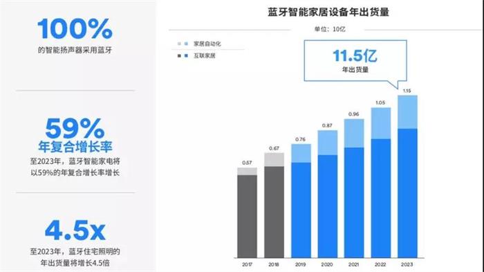 蓝牙技术联盟最新发布的《2019蓝牙市场最新资讯》显示,预计到2023年,蓝牙智能家居设备出货量将达到11.5亿。其中,蓝牙住宅照明设备的年出货量将增长4.5 倍;蓝牙智能家电将以59% 的年复合增长率增长。