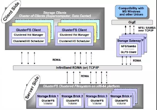 Gluster FS由Brick Server、Client和NAS网关组成(用来访问存储服务,但是Client只支持Linux,其他系统需要NAS网关提供存储服务),三者可以部署到同一个物理服务器上。NAS网关通过启动GLFS Client提供存储服务。