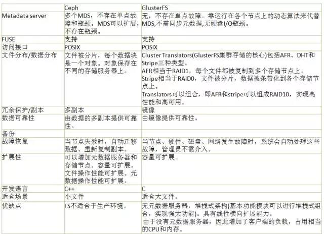 GlusterFS和Ceph是两个灵活的存储系统,有着相似的数据分布能力,在云环境中表现非常出色。在尝试了解GlusterFS与Ceph架构之后,我们来看看两者之间的简单对比。