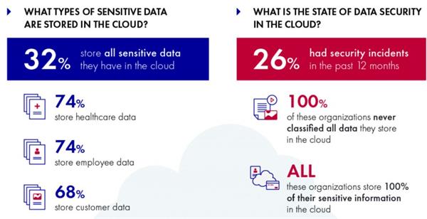在过去的12个月中,26%的医疗保健组织在云中至少发生过一次安全事件。这些组织有两个共同点:它们都没有将它们存储在云中的所有数据分类,并且所有这些数据都将所有敏感数据存储在云中。
