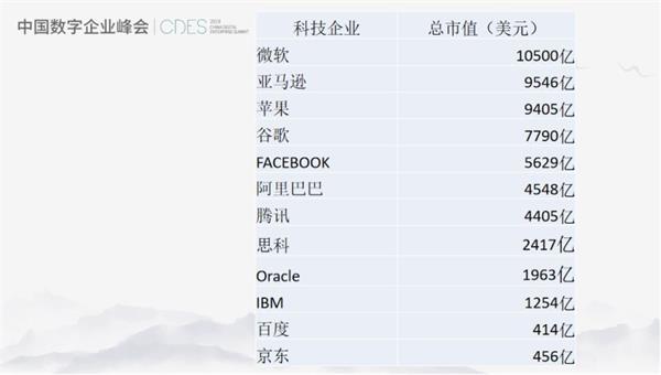 昨晚我一个个查了我国和全球几大互联网企业的总市值数据,目前微软的市值已经突破1万亿美元;亚马逊为9500多亿美金;苹果为9400多亿美金,谷歌为7790亿美元;这四家企业的市值大约在八九千亿美元上下波动。Facebook的市值排名第五、在5000-6000亿左右波动;阿里巴巴市值在4100-5000亿美元之间波动,腾讯是4405亿;但再往下看是我们非常熟悉的思科、甲骨文、IBM,大家是不是感觉到一种悲凉,感觉到这些科技巨头风光已经不再,今天思科的市值为2000多亿美元;IBM已经跌落到了一千多亿美元,再之后是我们熟悉的百度和京东。