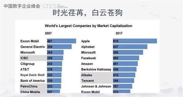 这是一张网上传的比较多的图片。2007年,全球范围内的上市公司市值最高的是能源公司、电信公司、银行等;而十年之后,很多公司都跌下榜单,看见的是互联网公司占据了鳌头。为什么短短十年的时间曾经的巨型跨国IT企业都跌落到下面?为什么会发生这一变化?