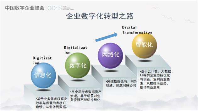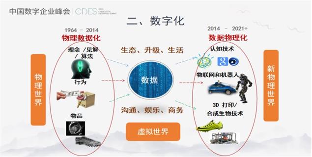 数字化:今天我们正在经历一个非常伟大的阶段,就是物理世界数字化,同时又从数字世界反馈回到物理世界当中。阿里巴巴讲过一句话,即“一切业务数据化,一切数据业务化”,这是一个闭环。所以数字化转型是通过不断的网络化、数字化、最终实现重构商业要素;数字化是一个从业务到数据、再让数据回到业务的过程。