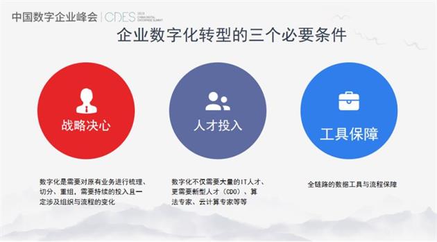 战略决心、人才投入、和工具保障是企业实现数字化转型的三个必要条件。