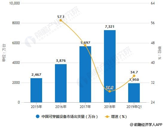 2015-2019年Q1中国可穿戴设备市场出货量统计及增长情况