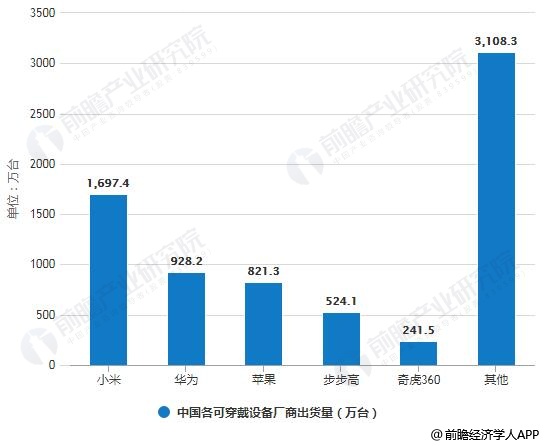 2018年中国可穿戴设备整体市场排名前五大厂商分别是小米、华为、苹果、步步高和奇虎360,出货量分别为1697.4、928.2、821.3、524.1、241.5万台,占比分别为23%、13%、11%、7%和3%,合计占的市场份额超过50%。