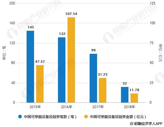 2015-2018年中国可穿戴设备投融资笔数、金额统计情况