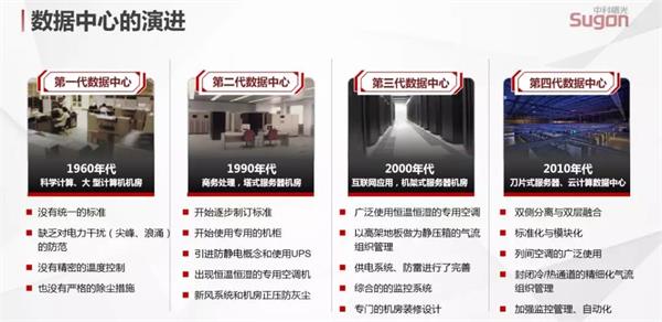 曙光根据数据中心发展做过一个划分,六十年代出现的机房可以称作第一代数据中心,主要应用是大型科研计算,每天工作8小时,因为透风度不好,只是关注洁净度,在机房建设上没有统一的标准。