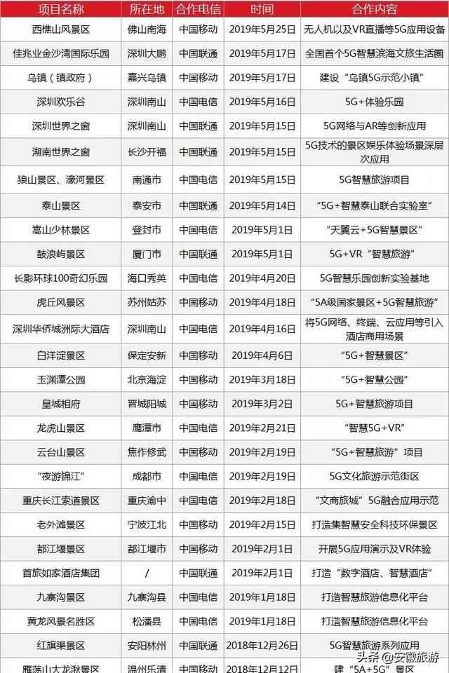 2月1日,都江堰景区成功开通5G基站,以“VR全景成都”为切入点,推进5G景区试点;2月19日,5G基站在云台山建成并开始试运行,推进“5G+智慧旅游”项目;5月17日,乌镇开展建设“乌镇5G示范小镇”,让乌镇基本实现5G网络全覆盖;近期,“5G+智慧旅游直播黄山”也正式签约,合肥市天鹅湖南岸的户外大屏,将对全省各地秀美景色进行24小时5G网络直播……