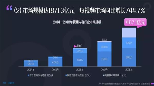 2018年整个视频内容行业的市场规模为1871.3亿元,作为视频产业的“生力军”,短视频市场增速最快,从2017年的55.3亿元增长到467.1亿元,同比增长744.7%。