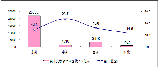 中部地区软件业收入增势突出,西部和东北地区增速较一季度有所提升。上半年,东部地区完成软件业务收入26335亿元,同比增长14.6%,增速与去年同期持平。中部地区完成软件业务收入1510亿元,增长23.7%,增速同比提高4.5个百分点,高出全国平均水平8.7个百分点。西部地区完成软件业务收入3948亿元,增长16%,增速同比提高2.5个百分点,比一季度提高1.2个百分点。东北地区完成软件业务收入1042亿元,同比增长11.8%,增速同比提高3个百分点,比一季度提高4.7个百分点。四个地区软件业务收入在全国总收入中的占比分别为:80.2%、4.6%、12%和3.2%。