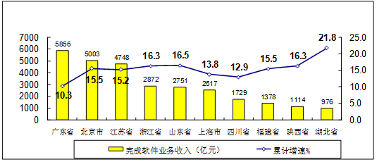 主要软件大省保持较快增长,部分中西部省市增长迅速。上半年,软件业务收入居前列的广东(同比增长10.3%)、北京(增长15.5%)、江苏(增长15.2%)、浙江(增长16.3%)、山东(增长16.5%)和上海(增长13.8%)完成业务收入合计占全国比重为72.3%,其中北京、江苏、浙江、山东增速分别高于全国平均水平0.5个、0.2个、1.3个和1.5个百分点。增速居前5名的省市有:江西(增长81.1%)、广西(增长74.9%)、云南(增长68.9%)、海南(增长43.8%)和青海(增长41.5%)。