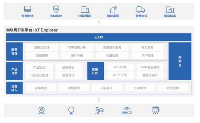 针对纷繁冗杂的物联网市场,腾讯云物联网开发平台IoT Explorer聚焦于一站式开发服务。提供主流的设备接入开发能力,并在应用侧将一些典型的应用场景能力开放给用户,大幅提高开发效率。